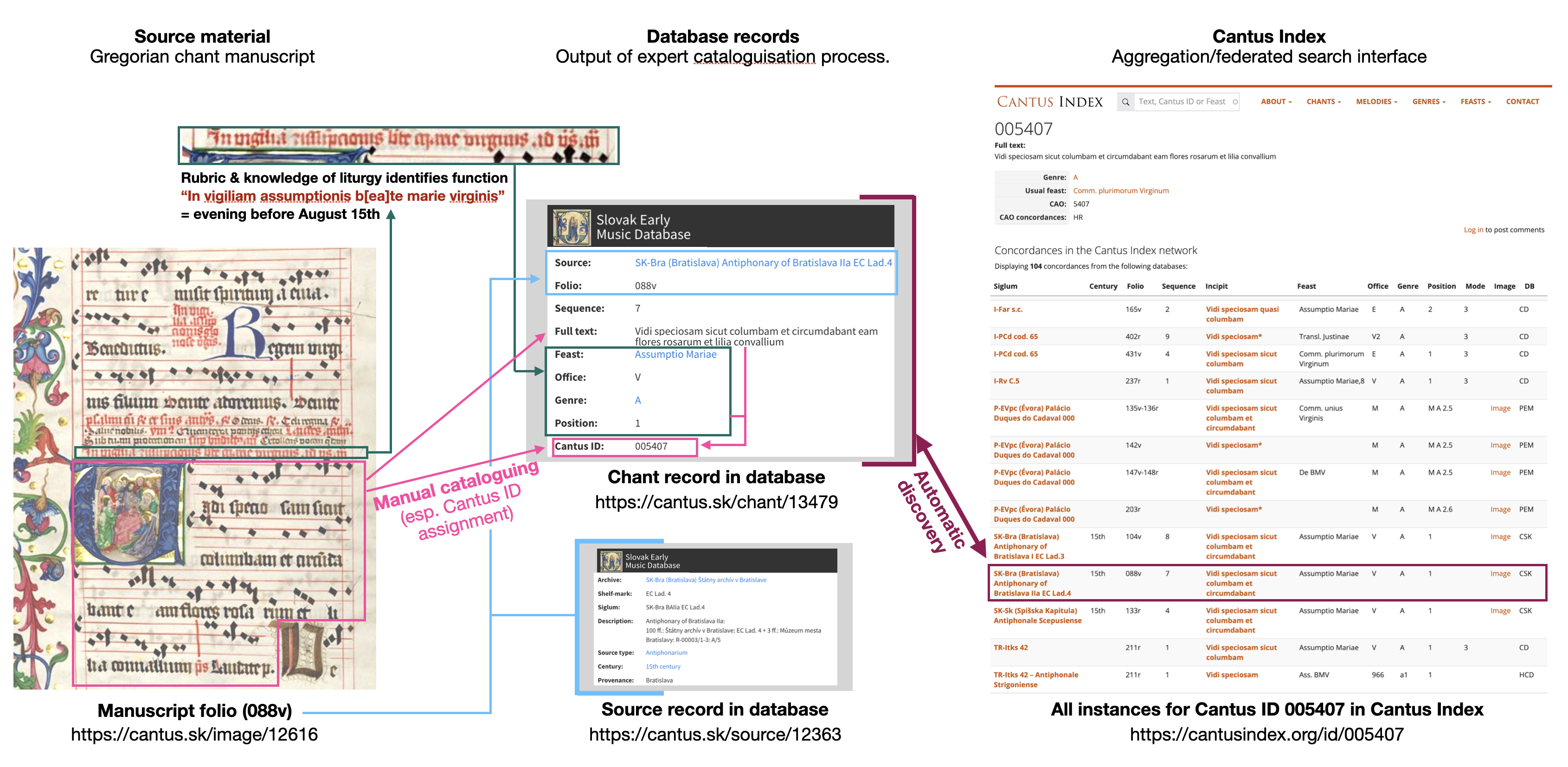 Chant data in the Cantus ecosystem. An expert reads a manuscript (today most often digitised), identifies individual instances of chants, and creates their database records: most importantly, assigning the Cantus ID to identify which unit of chant repertoire is on the page (pink process). Expertise in the liturgy of the Latin church is needed, as one must correctly interpret abbreviated notes in the manuscript --- rubrics --- in order to identify the liturgical position and function of the chant (dark green process); together with the text of the chant, this then allows one to assign the correct Cantus ID. A link to the source and page (folio) within the source is added (blue process). Once a record with a Cantus ID is added to a database in the Cantus ecosystem, the Cantus Index hub will retrieve the record, primarily via a search for all instances of the given Cantus ID across all databases that are registered with Cantus Index (purple process; automatic).